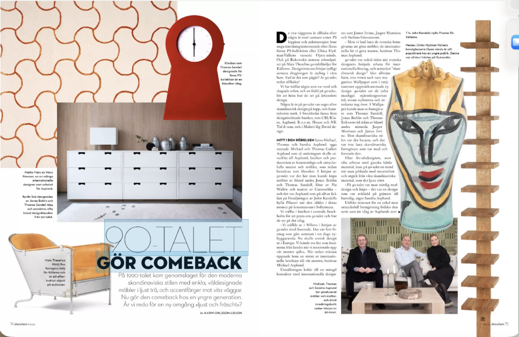 Vita väggar och möbler och prylar som ofta var färgstarka utropstecken. På 1990-talet var designern kung och i Stockholm fanns flera butiker som lanserade den nya formen. En av dem var Asplund, som startade 1990 och finns kvar än idag. Jag har träffat Sandra, Thomas och Michael Asplund för att prata om 90-talet och även intervjuat Gustav Broström om hur hans generation ser på 90-talsinredning idag. Läs artikeln ”90-talet gör comeback” i Sköna Hem #3 2026.
